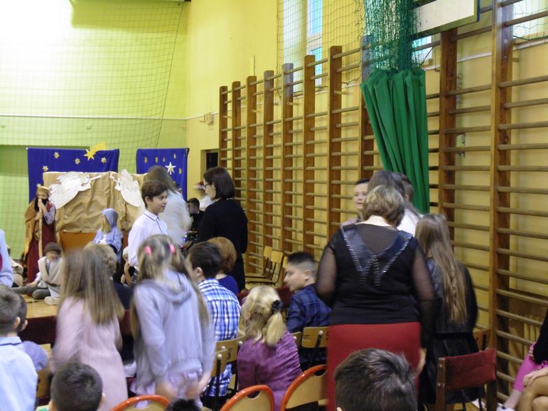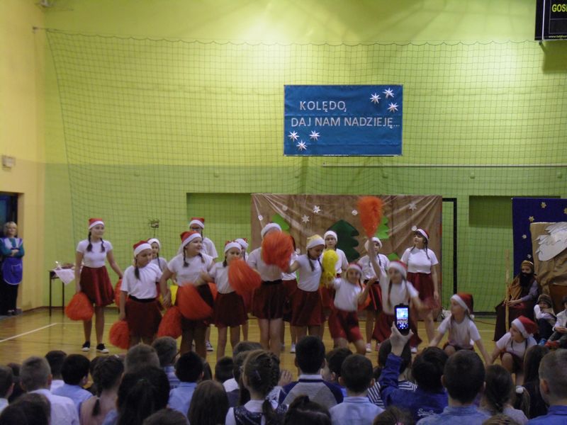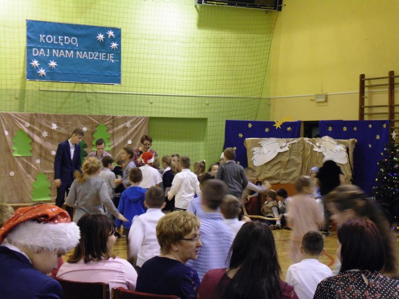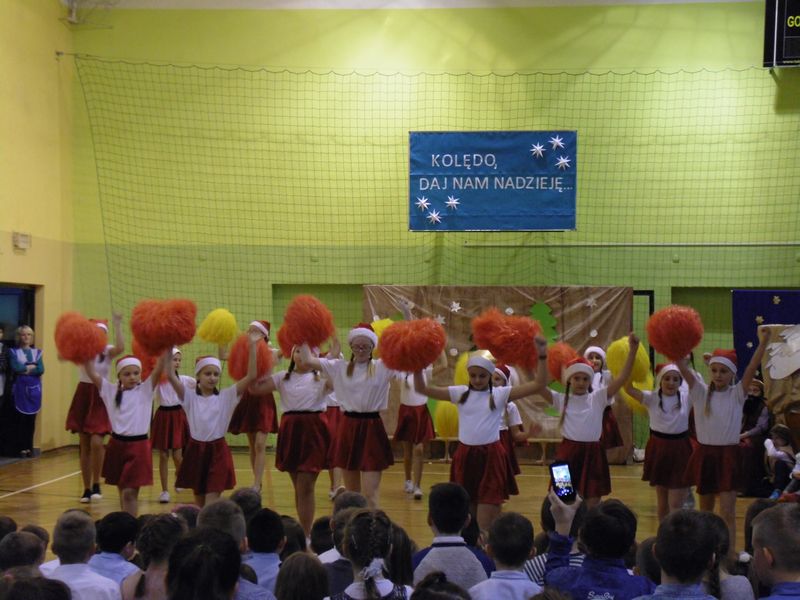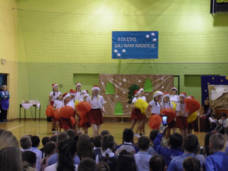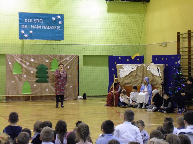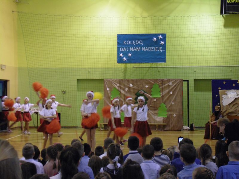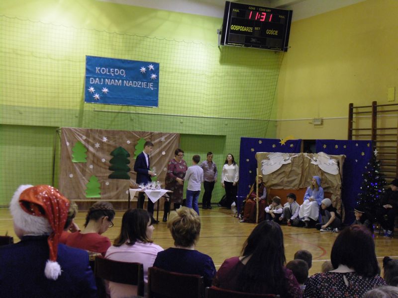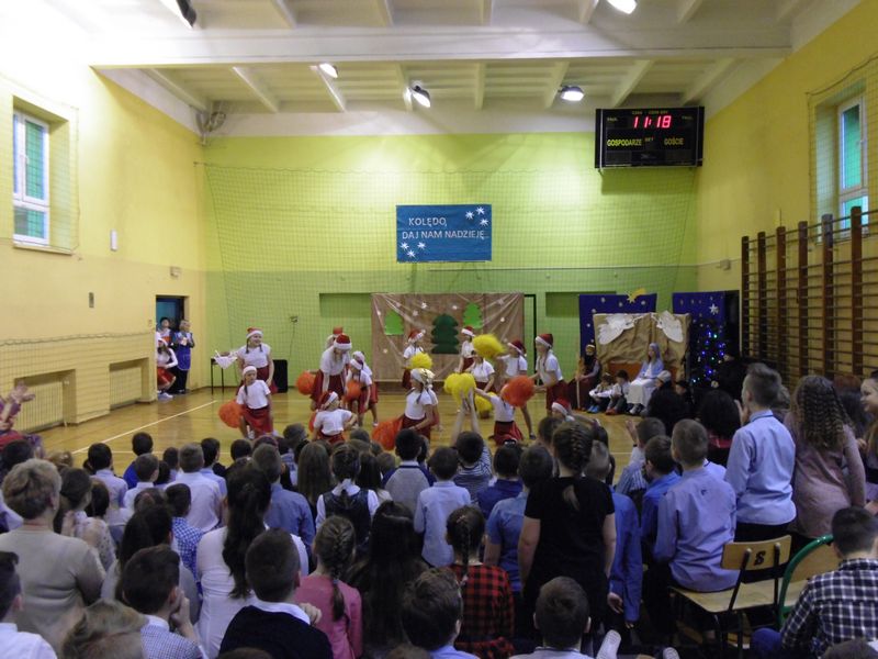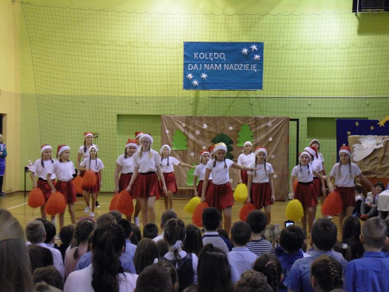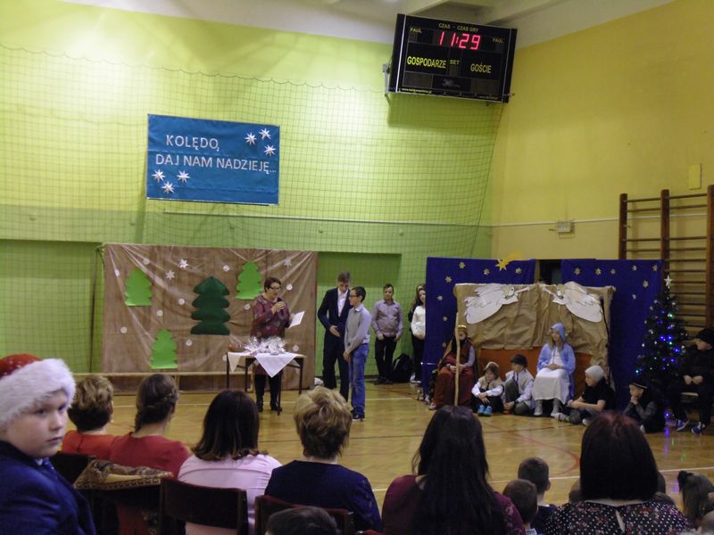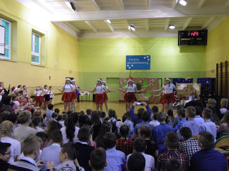 Najpierw uczniowie klasy 2b gimnazjalnej, 7a oraz 4a zaprezentowali program słowno-muzyczny, w którym przedstawili polskie zwyczaje związane z Bożym Narodzeniem. Śpiewali też tradycyjne kolędy i pastorałki. Na gitarach grały uczennice: Karolina Szuba, Gabriela Osada i Sabrina Kowalczyk