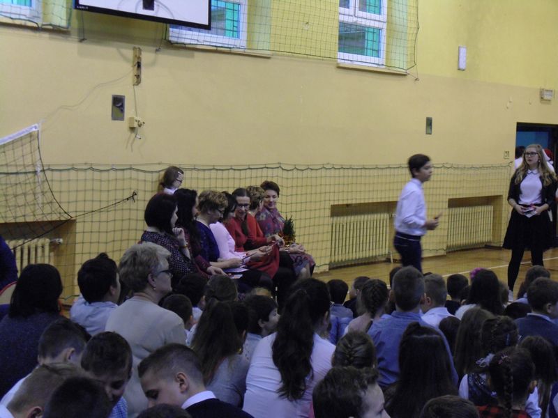 Na sali gimnastycznej zebrała się cała społeczność szkoły: Dyrektor szkoły Bogumiła Jagielska, wicedyrektor Barbara Kondziołka, nauczyciele, pracownicy, uczniowie oraz rodzice.