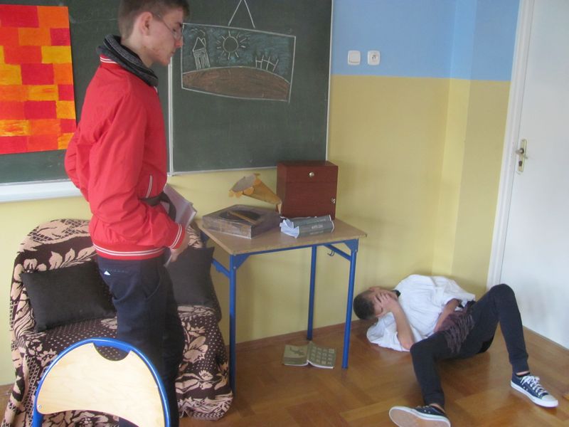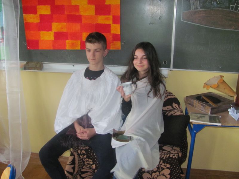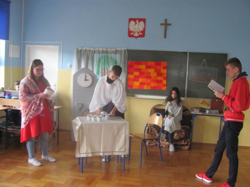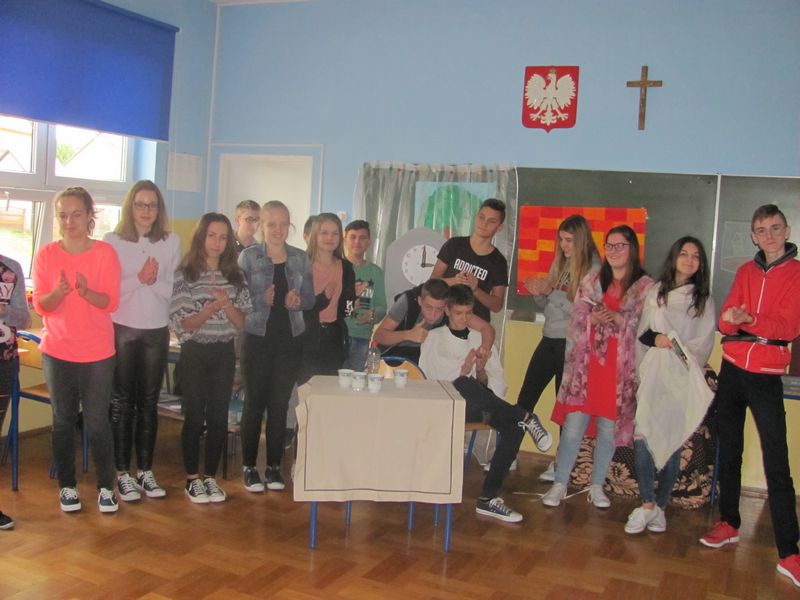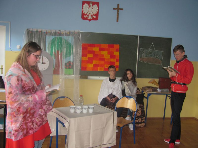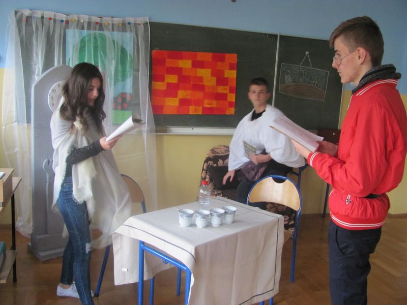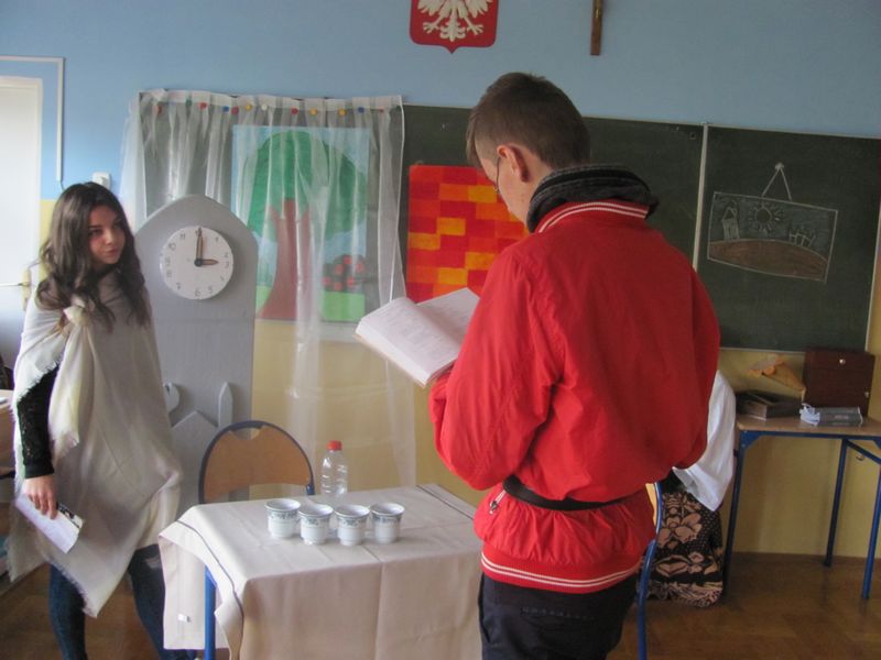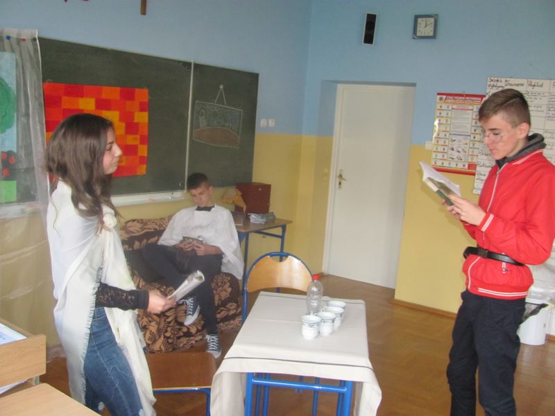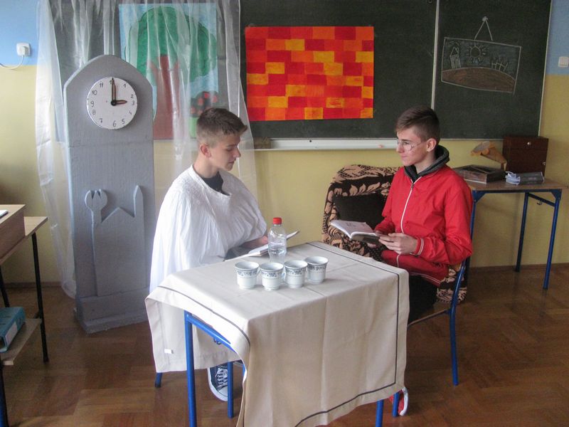 Młodzież z klasy IIb przygotowała inscenizację fragmentów dramatu opowiadającego o sporze między Cześnikiem a Rejentem. Każdy uczeń miał przydzielone zadanie. Jedni byli aktorami, inni wykonali scenografię lub przygotowali muzykę i efekty dźwiękowe. Nad całością czuwał reżyser. Kilku chłopców przygotowało też prezentacje multimedialne dotyczące bohaterów dramatu.