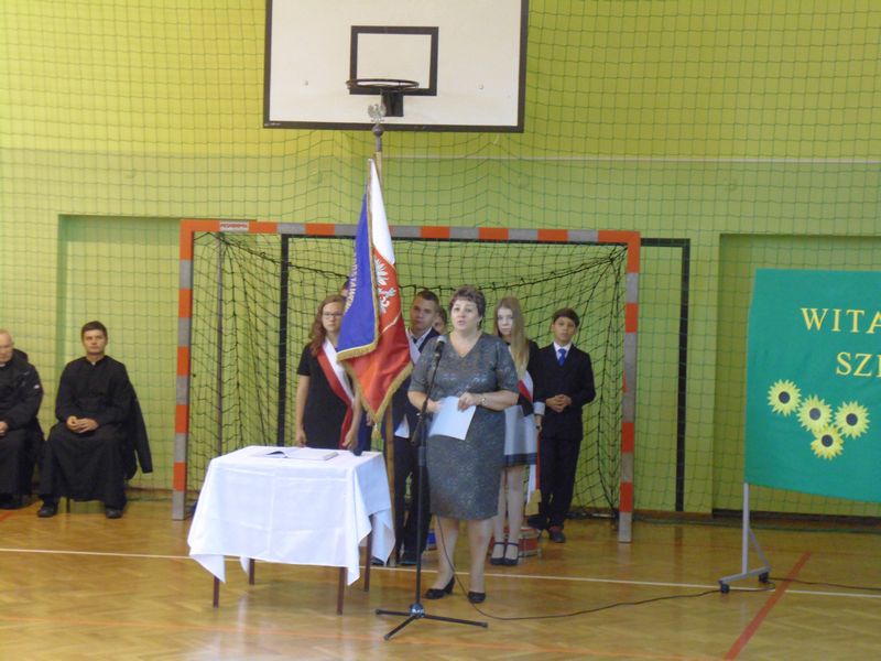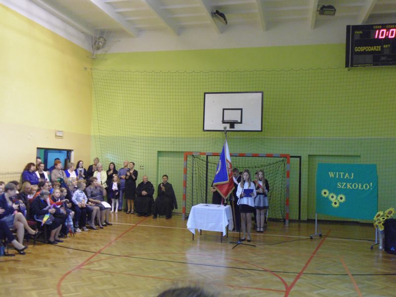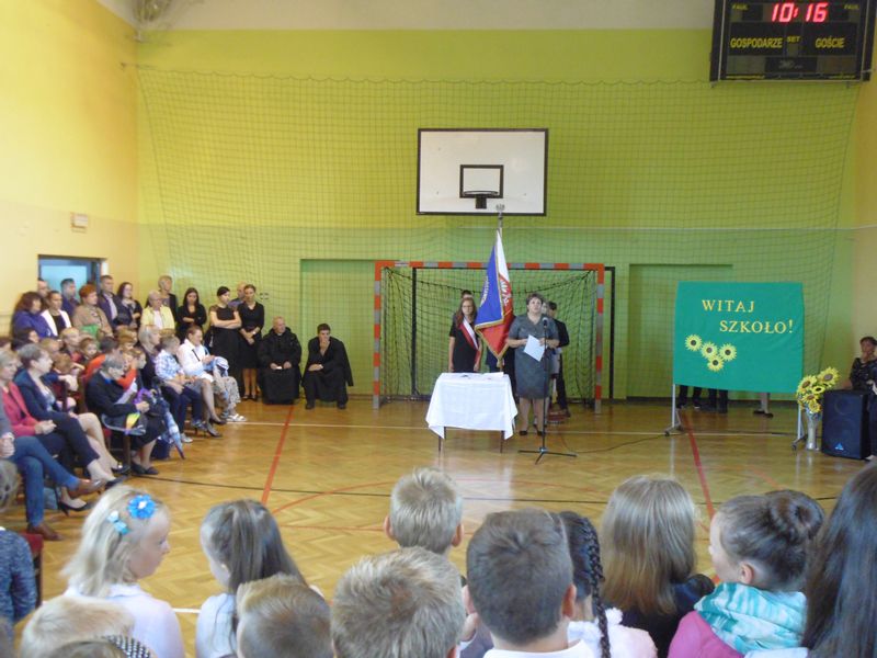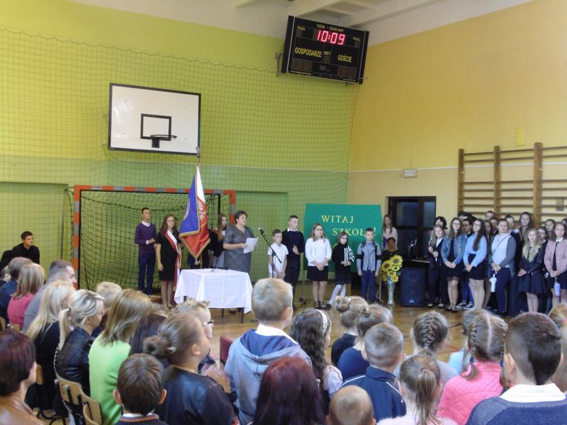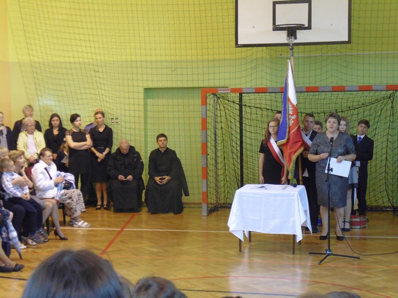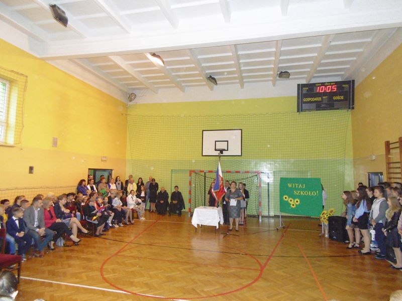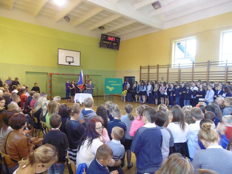 Nowy rok szkolny rozpoczęliśmy Mszą św. sprawowaną w kościele parafialnym przez Ks. katechetę Karola Górę. Następnie społeczność szkoły spotkała się na sali gimnastycznej. Pani Dyrektor Bogumiła Jagielska powitała grono pedagogiczne, uczniów i rodziców oraz omówiła organizację pracy szkoły, która w związku z reformą oświaty zaczęła funkcjonować w nowej strukturze jako ośmioletnia szkoła podstawowa z oddziałami gimnazjalnymi. Funkcję zastępcy dyrektora będzie pełniła Pani Barbara Kondziołka.